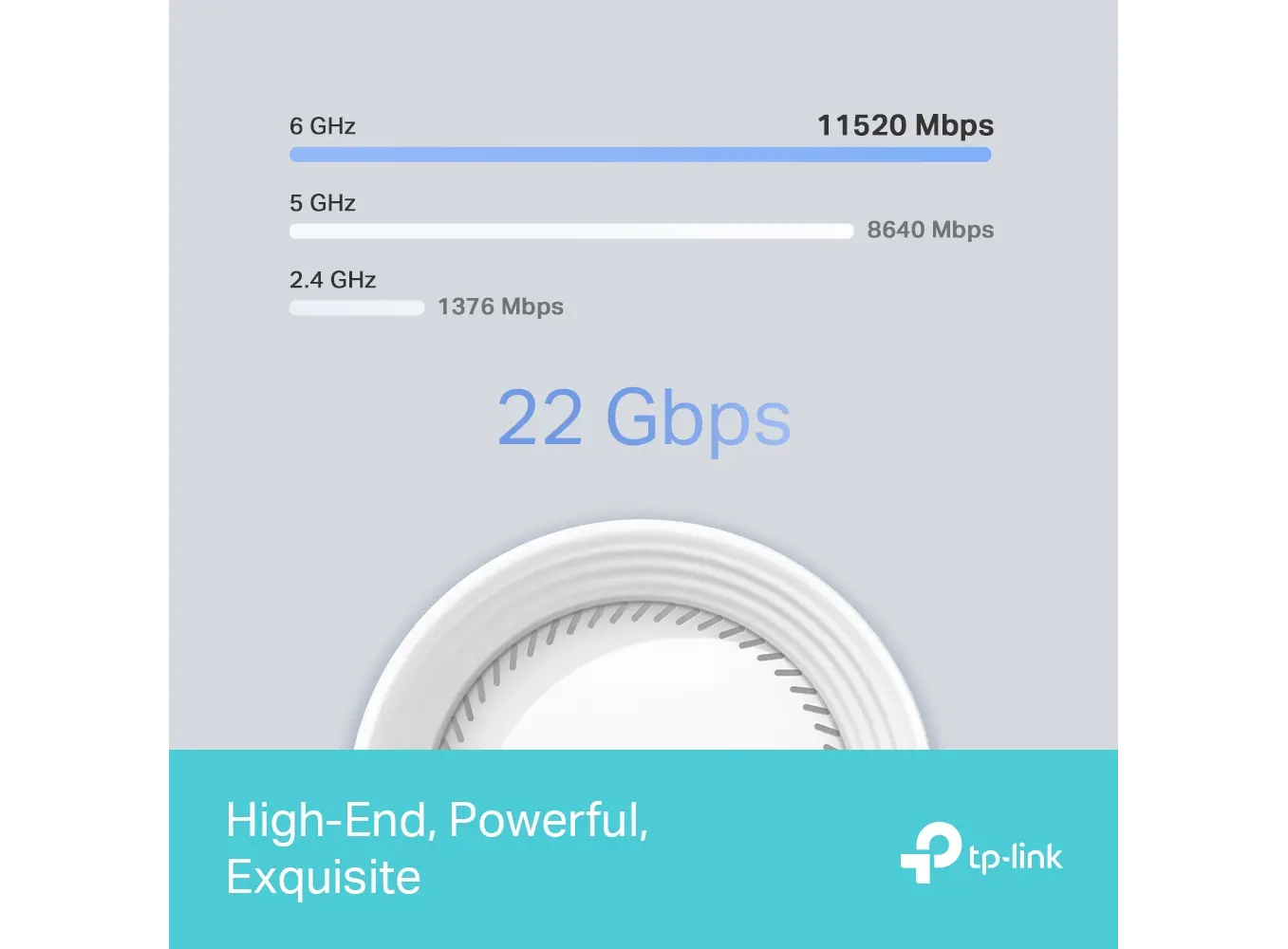 - მონაცემთა უსადენოდ გადაცემის სიჩქარე: 2.4 GHz: 1376 Mbps, 5 GHz: 8640 Mbps, 6 GHz: 11520 Mbps
