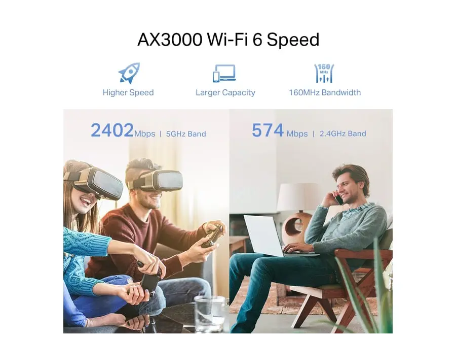 - მონაცემთა უსადენოდ გადაცემის სიჩქარე: 2.4GHz 574 Mbps, 5GHz 2402 Mbps