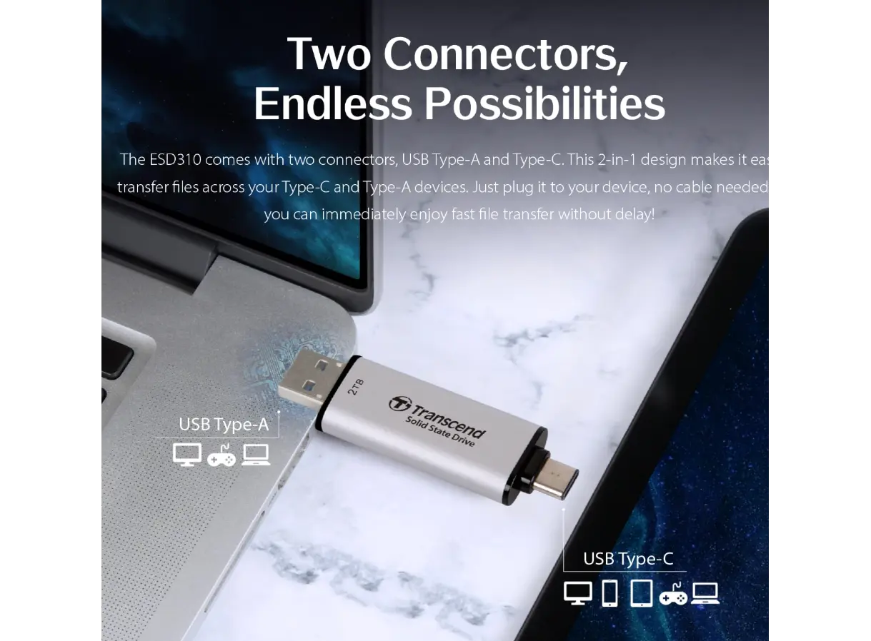 Transcend ESD310S არის ულტრაკომპაქტური პორტაბელური SSD, რომელიც აერთიანებს ფლეშ მეხსიერების სიმსუბუქესა და გარე მყარი დისკის მაღალ წარმადობას. დახვეწილი ვერცხლისფერი მეტალის კორპუსი უზრუნველყოფს მოწყობილობის გამძლეობასა და სითბოს ეფექტურ გადანაწილებას სტაბილური მუშაობისთვის. მისი უმთავრესი უპირატესობა ორმაგი კონექტორია (USB Type-A და Type-C), რაც საშუალებას გაძლევთ მარტივად დაუკავშიროთ იგი ნებისმიერ თანამედროვე ლეპტოპს, სმარტფონს ან სათამაშო კონსოლს ყოველგვარი დამატებითი კაბელის გარეშე. USB 10Gbps ინტერფეისის წყალობით, მონაცემთა გადაცემა ხდება მყისიერად, რაც მნიშვნელოვნად ზოგავს დროს დიდ ფაილებთან მუშაობისას. 512GB ტევადობა იდეალურია სამუშაო დოკუმენტების, მაღალი გარჩევადობის ფოტოებისა და მედია კონტენტის საიმედოდ შესანახად. ეს არის საუკეთესო არჩევანი მათთვის, ვინც ეძებს მაქსიმალურ მობილურობას, სტილსა და სისწრაფეს ერთ მოწყობილობაში.