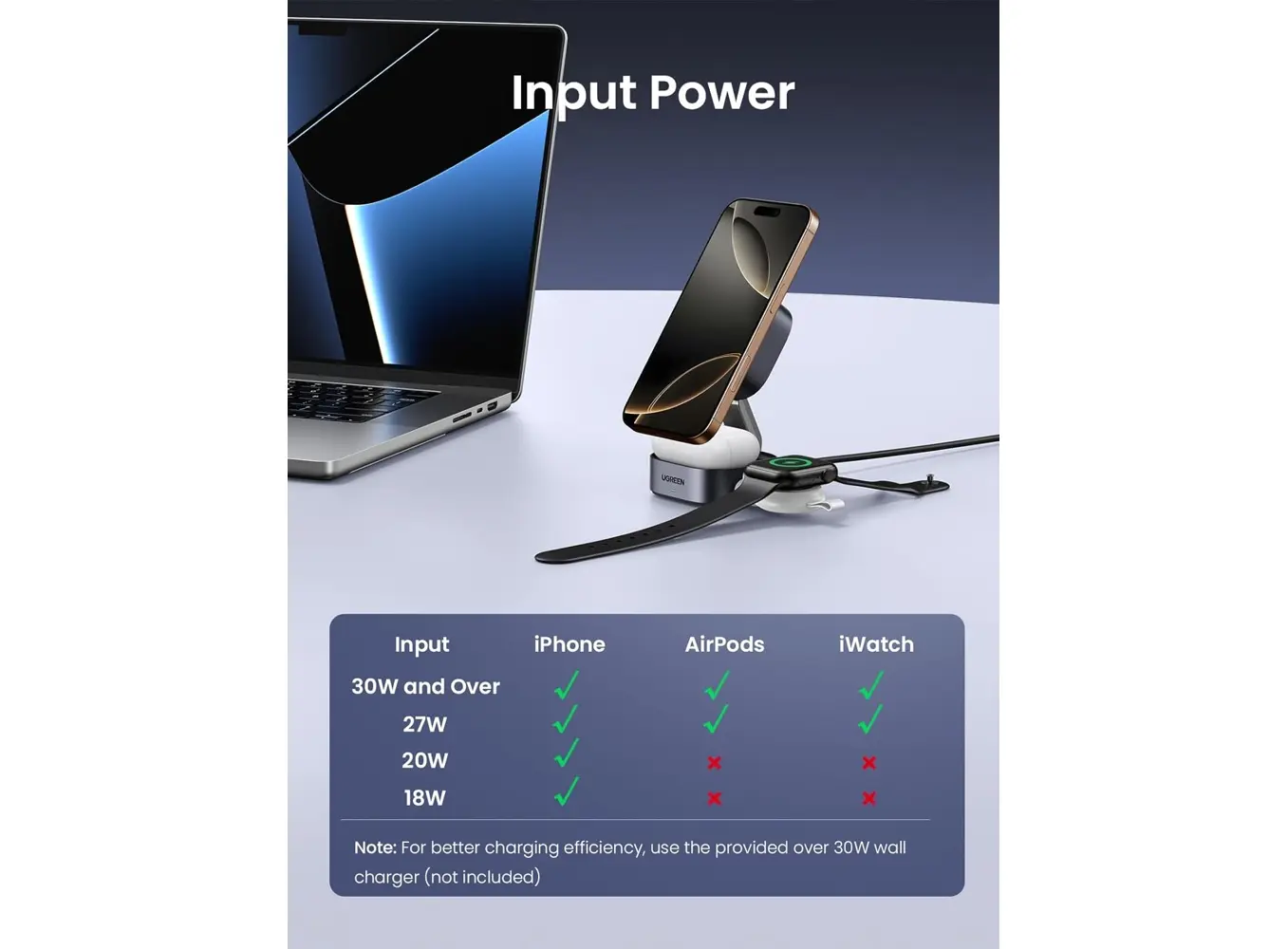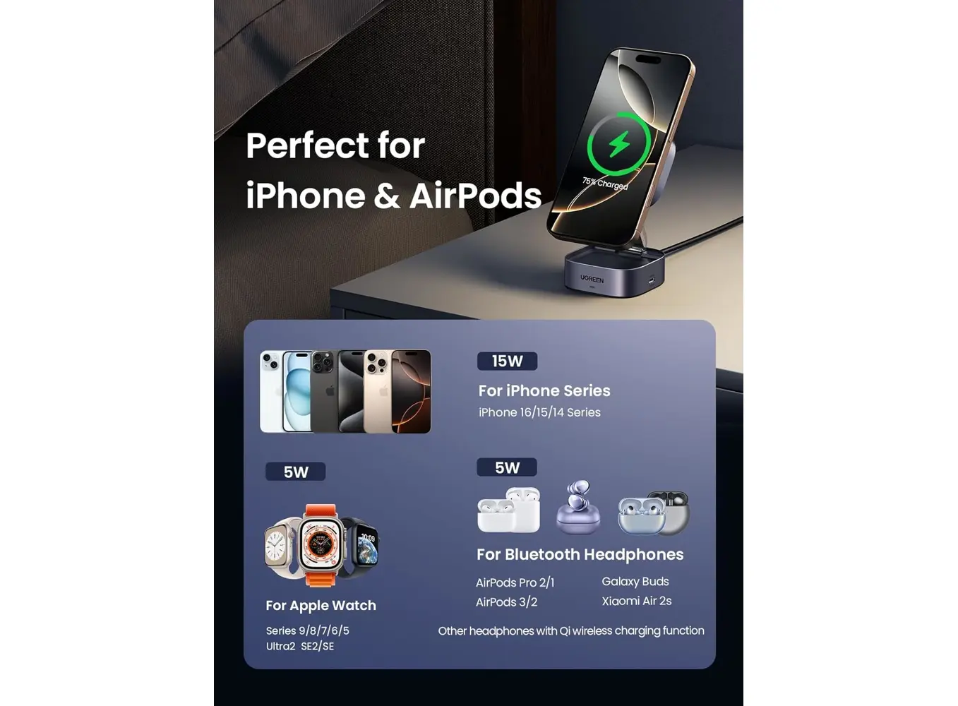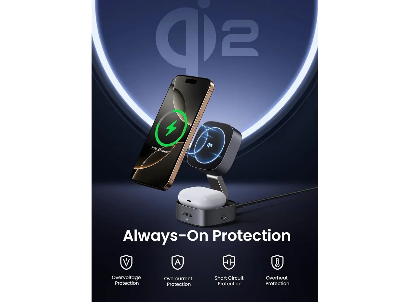 უსადენო დამტენი UGREEEN W702 (35316) MagFlow Qi2, 25W, Magnetic Foldable Charging Station, Dark Gray