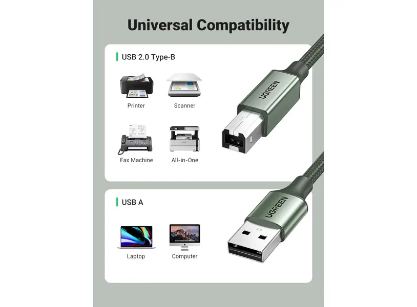 UGREEN 90817 პრინტერის კაბელი განკუთვნილია USB-A პორტის მქონე მოწყობილობებისა და USB-B პორტის მქონე პრინტერების დასაკავშირებლად. მისი 3-მეტრიანი სიგრძე უზრუნველყოფს დამატებით მოქნილობას და კომფორტს, რაც საშუალებას გაძლევთ ეფექტურად მოაწყოთ სამუშაო სივრცე. კაბელი მხარს უჭერს მონაცემთა სტაბილურ და სწრაფ გადაცემას, რაც აუცილებელია მაღალი ხარისხის ბეჭდვისთვის. გამძლე მასალები და მყარი კონსტრუქცია უზრუნველყოფს ხანგრძლივ გამოყენებას. გამორჩეული მწვანე ფერი დიზაინს უნიკალურობასა და ელეგანტურობას სძენს.