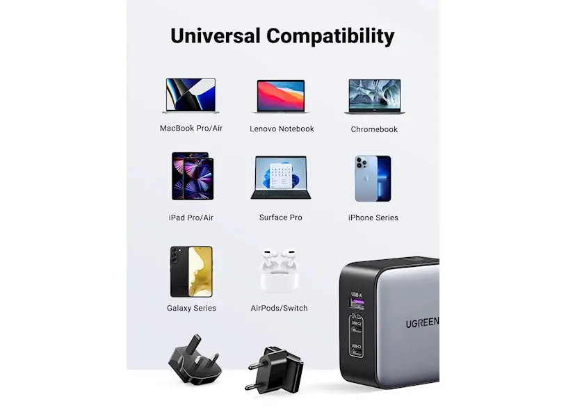 - USB-A 5V/3A, 9V/2A, 12V/1.5A, 4.5V/5A, 5V/4.5A; 22.5 W