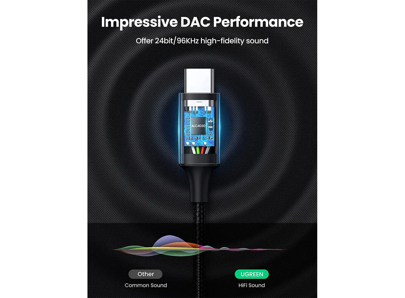 - გაუმჯობესებული DAC ჩიპით, Type-C-დან Aux კაბელს აქვს 24