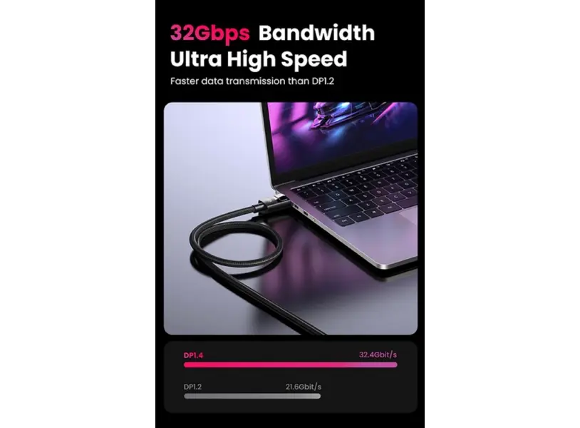 UGREEN DP114 (80393) 8K DisplayPort to DisplayPort კაბელი არის მაღალი ხარისხის და სანდო გადაწყვეტა ვიდეოსა და აუდიოს გადაცემისთვის. კაბელი მხარს უჭერს 8K რეზოლუციას (7680x4320) და 60Hz განახლებას, რაც უზრუნველყოფს უმაღლეს გამოსახულებას და სითხეს. 3-მეტრიანი სიგრძე ოპტიმალურია სახლისა თუ ოფისის მოწყობილობების დასაკავშირებლად. მისი მყარი და გამძლე დიზაინი უზრუნველყოფს ხანგრძლივ გამოყენებას, ხოლო Plug-and-Play ფუნქცია გაძლევთ მარტივ ინსტალაციას. კაბელის შავი ფერი და ელეგანტური სტილი შესანიშნავად ერგება ნებისმიერ ტექნიკურ გარემოს.