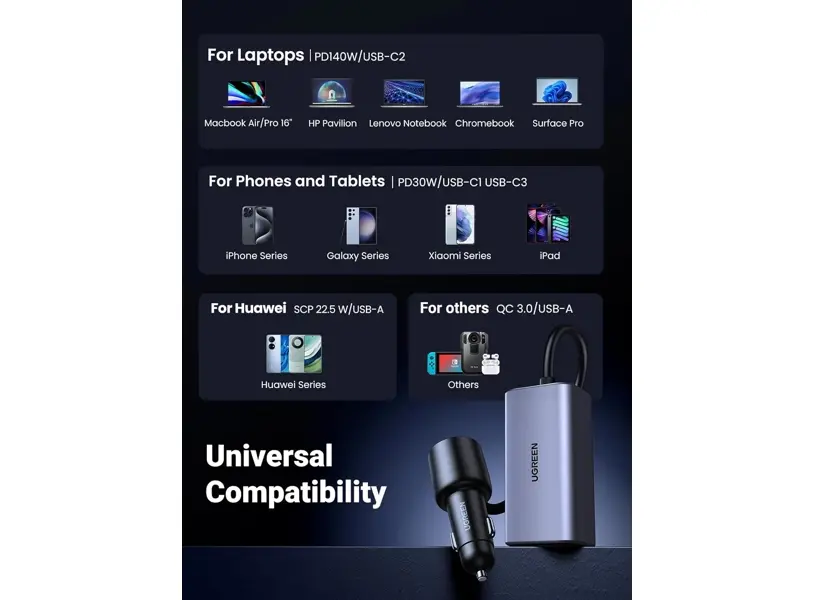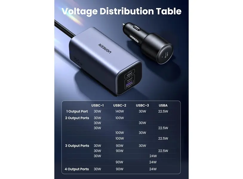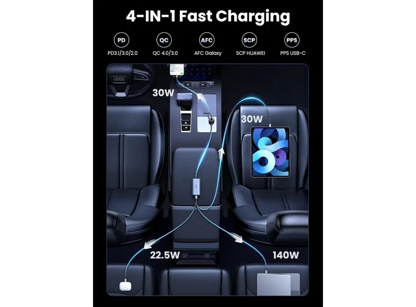 UGREEN EC706 (35571) არის 150W სიმძლავრის ავტომობილის დამტენი, რომელიც უზრუნველყოფს სწრაფ და უსაფრთხო დატენვას მგზავრობის დროს. Type-C და USB პორტების კომბინაცია საშუალებას გაძლევთ ერთდროულად დატენოთ სხვადასხვა მოწყობილობა, როგორიცაა სმარტფონები, ტაბლეტები, ლეპტოპები და სხვა გაჯეტები. ჭკვიანი ენერგიის მართვის სისტემა იცავს მოწყობილობებს გადახურების, გადატვირთვისა და მოკლე ჩართვისგან. კომპაქტური და გამძლე დიზაინი იდეალურად ერგება ნებისმიერი ავტომობილის სალონს, რაც მას შეუცვლელ აქსესუარად აქცევს ნებისმიერი მძღოლისთვის.