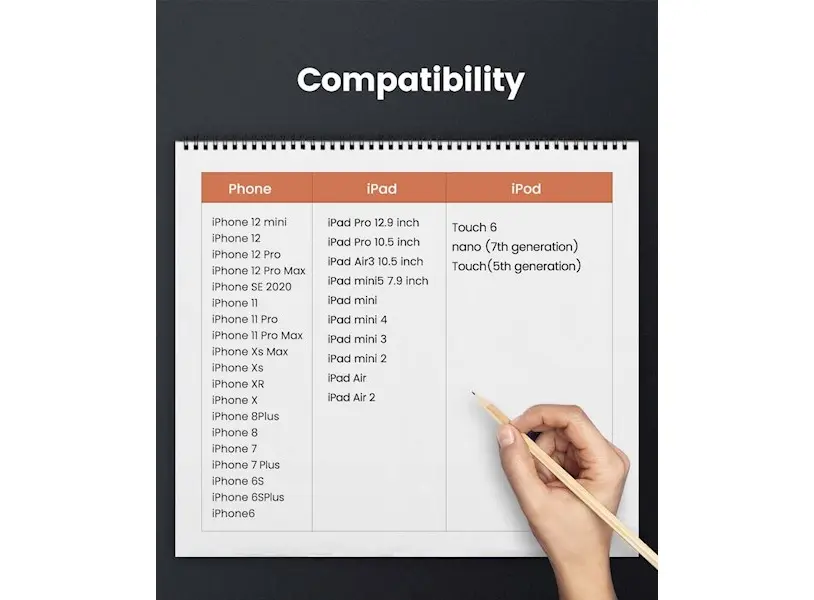 - თავსებადია iPhone, iPad Air, iPad mini / mini2, iPad მე -4 თაობის, iPod მე -5 თაობის და iPod nano მე -7 თაობისთვის