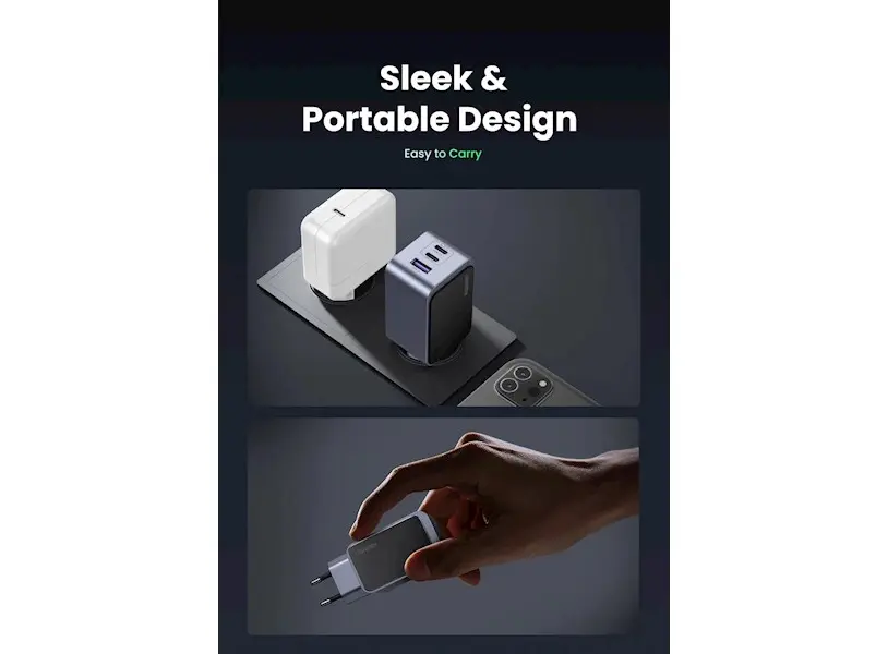 ობილურის დამტენი UGREEN X553 (35042) Nexode Air 65W არის კომპაქტური და მძლავრი დამტენი, რომელიც შექმნილია თქვენი მოწყობილობების სწრაფი და ეფექტური დატენვისთვის. მისი USB და USB-C პორტები უზრუნველყოფს მრავალფეროვან თავსებადობას სხვადასხვა მოწყობილობებთან, მათ შორის სმარტფონებთან, ტაბლეტებთან და ლეპტოპებთან. 65W სიმძლავრე საშუალებას გაძლევთ ერთდროულად დატენოთ რამდენიმე მოწყობილობა სწრაფად და უსაფრთხოდ. დამტენი აღჭურვილია თანამედროვე დაცვის მექანიზმებით, რაც იცავს მოწყობილობას გადატვირთვისა და გადახურებისგან. UGREEN X553 გამოირჩევა ელეგანტური ნაცრისფერი დიზაინით და კომპაქტური ზომით, რაც ხდის მას იდეალურ გამოსავალს ყოველდღიური გამოყენებისთვის ან მოგზაურობისას.
