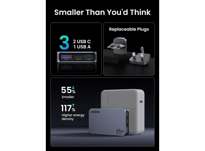 UGREEN X753 (25356) Nexode Pro 65W მობილური დამტენი გამოირჩევა კომპაქტური Ultra Slim დიზაინით, რაც იდეალურს ხდის ბიზნესსა და ტურისტულ მოგზაურობებზე. მომძლევი Type‑C და USB პორტები საშუალებას აძლევს რამდენიმე მოწყობილობის სწრაფ და უსაფრთხო დამუხტვას ერთდროულად. 65W მაქსიმალური გამომავალი უნარი უზრუნველყოფს ლეპტოპების, სმარტფონებისა და ტაბლეტების სწრაფ დატენვას სწრაფი დატენვის მხარდაჭერით. მრავალდაცვითი ტექნოლოგიები იცავს ზედმეტ დაძაბულობას, გათბობას და მოკლე ჩარევით გამოწვეულ რისკებს, რაც უზრუნველჰყოფს უსაფრთხო და მდგრადოპროდუქტიულ ექსპლუატაციას. ბონუსად, ჩამონტაჟებული პლაგი და ქვეყანაში შესაბამისი ძაბვის მხარდაჭერა იდეალურია საერთაშორისო გამოყენებისთვის. ელეგანტური ნაცრისფერი მზა მომზადებით, ეს დამტენი შეთავაზება აქვთ უტრასტილი, მზისებრი დიზაინით და პრემიუმ ხარისხით გიბრუნებთ ენერგიის სრულ კონტროლს ნებისმიერ მომენტში.