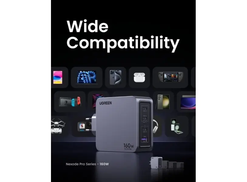 UGREEN X763 (25877) Nexode Pro არის მძლავრი და უნივერსალური მობილურის დამტენი, რომელიც უზრუნველყოფს 160W-იან სწრაფ და უსაფრთხო დატენვას. მისი Type-C და USB პორტები საშუალებას გაძლევთ ერთდროულად დატენოთ სხვადასხვა მოწყობილობა, მათ შორის სმარტფონები, ტაბლეტები, ლეპტოპები და სხვა გაჯეტები. მოწინავე ტექნოლოგია იცავს მოწყობილობებს გადახურების, გადატვირთვისა და მოკლე ჩართვისგან. კომპაქტური და ელეგანტური დიზაინი იდეალურია როგორც სახლის, ისე მოგზაურობის პირობებისთვის, რაც ამარტივებს თქვენი მოწყობილობების ენერგიით უზრუნველყოფას ნებისმიერ დროსა და ადგილას.