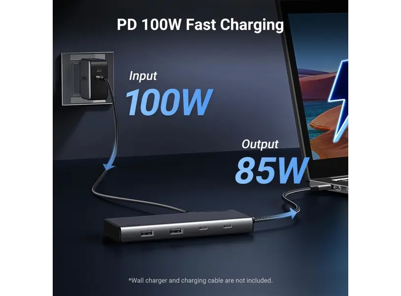 - დოკ სადგური გთავაზობთ 85 ვატამდე USB-C დატენვას