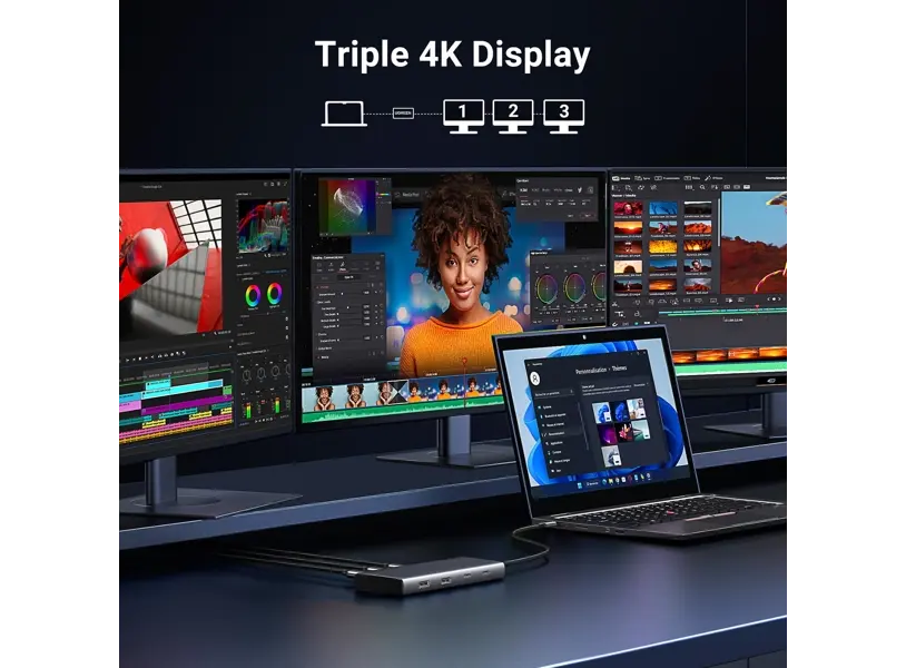 UGREEN CM639 Revodok 308 არის მაღალი ხარისხის 8-დან ერთში USB-C დოკ სადგური, რომელიც აერთიანებს საჭირო ინტერფეისებს ერთ დახვეწილ და კომპაქტურ კორპუსში. აღჭურვილია HDMI და DisplayPort პორტებით 4K@60Hz გამოსახულების მხარდასაჭერად, USB-A პორტებით სწრაფი მონაცემთა გადაცემისთვის, USB-C PD პორტით (100W) ლეპტოპების ან სხვა მოწყობილობების დამუხტვისთვის, ასევე SD და Micro SD ბარათების წამკითხველით. იდეალურია მათთვის, ვინც მუშაობს მრავალმონიტორიან გარემოში ან სურს ერთდროულად რამდენიმე მოწყობილობის დაკავშირება. მაღალხარისხიანი ალუმინის შენადნობი უზრუნველყოფს გამძლეობას და თერმულ სტაბილურობას. Plug & Play ფუნქციონალი გამარტივებს გამოყენებას, დამატებითი პროგრამული უზრუნველყოფის გარეშე. იდეალურია როგორც macOS, ისე Windows სისტემებისთვის.