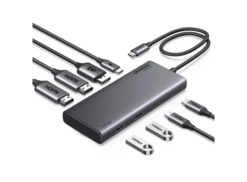 USB-C ჰაბი UGREEN CM639 (35625) Revodok 308, HDMI, DP, Type-C, USB-A, PD, 8 in 1 USB C Docking Station, Grey