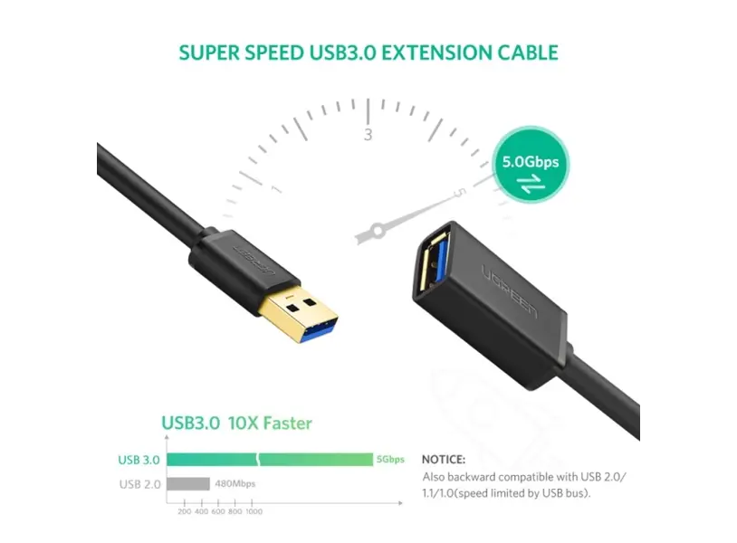 UGREEN US129 (30126) USB 3.0 A Male to Female დამაგრძელებელი კაბელი უზრუნველყოფს სანდო და მაღალსიჩქარიან კავშირს თქვენი მოწყობილობებისთვის. 1.5-მეტრიანი სიგრძე იძლევა დამატებით მოქნილობას და კომფორტს მოწყობილობების დაკავშირებაში. USB 3.0 ტექნოლოგია უზრუნველყოფს მონაცემთა გადაცემის სიჩქარეს 5Gbps-მდე, რაც 10-ჯერ უფრო სწრაფია, ვიდრე USB 2.0. კაბელი დამზადებულია ბრტყელი და გამძლე დიზაინით, რაც უზრუნველყოფს ადვილ ტრანსპორტირებას და ხანგრძლივ გამოყენებას. მისი შავი ფერი და ელეგანტური სტილი შესანიშნავად ერგება ნებისმიერ ტექნიკურ გარემოს.