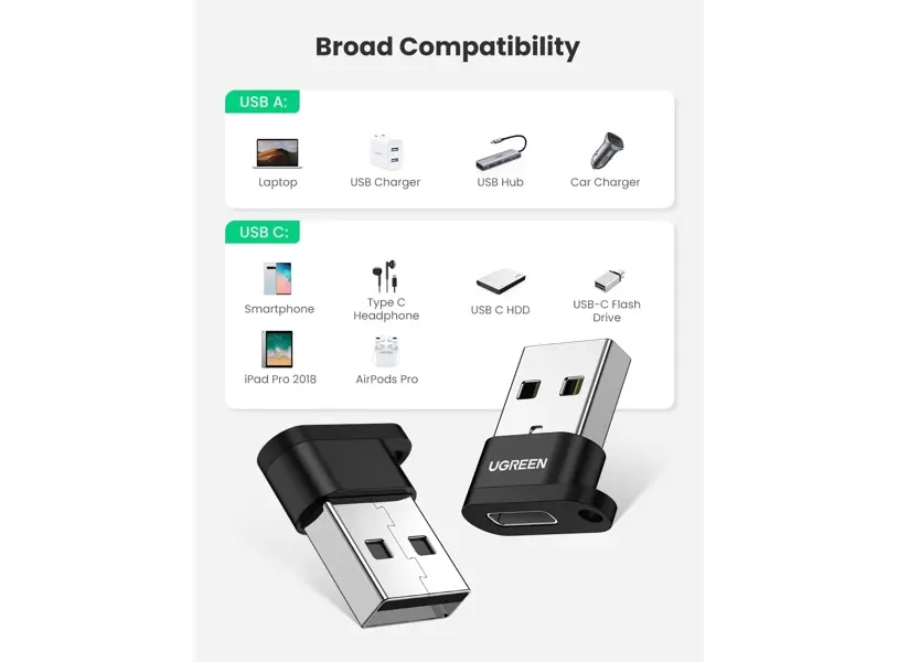 UGREEN US280 (50568) USB A Male to USB-C Female ადაპტერი არის კომპაქტური და მრავალფუნქციური მოწყობილობა, რომელიც საშუალებას გაძლევთ გადაიყვანოთ USB-A პორტი USB-C პორტად. ეს ადაპტერი უზრუნველყოფს მაღალსიჩქარიან მონაცემთა გადაცემას და საშუალებას გაძლევთ დაკავშიროთ USB-C მოწყობილობები USB-A პორტთან. მისი მყარი კონსტრუქცია და მაღალი ხარისხის მასალები უზრუნველყოფს ხანგრძლივობას და საიმედოობას. ადაპტერი კომპაქტური და მსუბუქია, რაც ხელსაყრელია ყოველდღიური გამოყენებისთვის. შავი ფერი და დახვეწილი დიზაინი ადაპტერს უფრო პრაქტიკულს და ელეგანტურს ხდის.