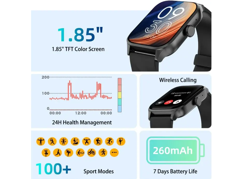 WEOFLY ACTIVE BLACK სმარტ საათი წარმოადგენს მძლავარ და მრავალმხრივ მოწყობილობას აქტიური ცხოვრების წესის მოყვარულთათვის. მისი გამძლე, შავი პოლიმერული კორპუსი და კომფორტული, ოფლის გამძლე სამაგრი უზრუნველყოფს სტაბილურობას ვარჯიშის დროს. საათი აღჭურვილია გულისცემის, SpO₂ და ძილის მონიტორინგის სისტემებით, რაც ეხმარება ჯანმრთელობის კონტროლს 24/7. საათშია 20+ სპორტული რეჟიმი, მათ შორის სირბილი, ველოსიპედი, იოგა და ა.შ., რაც დაგეხმარებათ მიზნის მიღწევაში. ციფრული ეკრანი ჰუმანი, მომრგვალებული ფორმით, ადვილად თიშება კომფორტით და საშუალებას აძლევს სწრაფად გადაახვედროთ შეტყობინებები, ზარები და მუსიკის კონტროლი. წყალგაუმტარი დონე 5ATM ნიშნავს, რომ შეგიძლიათ დაიცვათ დასვენების ან ცურვის დროსაც კი. WEOFLY ACTIVE BLACK არის იდეალური საშუალება თქვენთვის, ვინც აფასებს ტექნოლოგიას, სტილს და ჯანმრთელობას ერთ მოწყობილობაში.