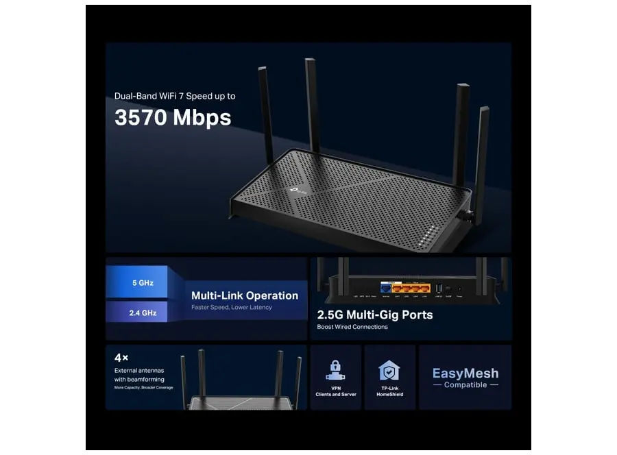 TP-Link Archer BE3600 Dual-Band Wi-Fi 7 Router გთავაზობთ უახლესი თაობის უკაბელო კავშირს, რომელიც უზრუნველყოფს მაღალ სიჩქარესა და სტაბილურობას. Wi-Fi 7 ტექნოლოგია იძლევა გაუმჯობესებულ გამტარუნარიანობას და გლუვ ინტერნეტ-გამოცდილებას, რაც იდეალურია გეიმინგისა და 4K/8K ვიდეო სტრიმინგისთვის.
