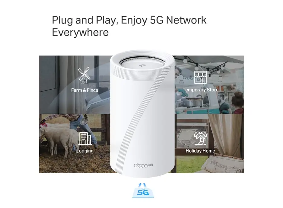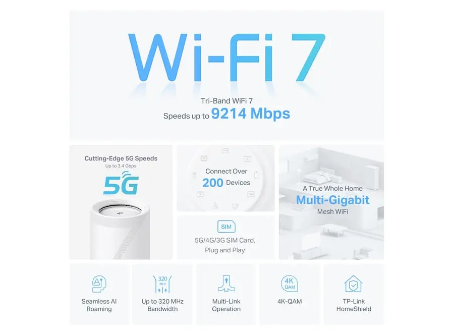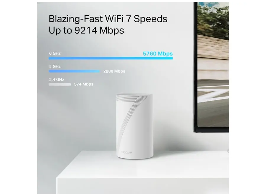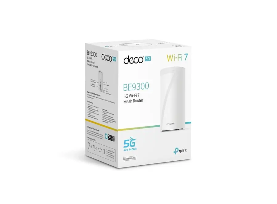 TP-Link BE65-5G BE9300 Tri-Band Whole Home Mesh Wi-Fi 7 Gateway აერთიანებს უახლეს Wi-Fi 7 ტექნოლოგიასა და 5G მხარდაჭერას, რაც უზრუნველყოფს უსწრაფეს და სტაბილურ კავშირს. მისი Tri-Band არქიტექტურა უზრუნველყოფს საერთო სიჩქარეს 9214 Mbps-მდე: 5760 Mbps (6 GHz), 2880 Mbps (5 GHz) და 574 Mbps (2.4 GHz). 5G მხარდაჭერით, მოწყობილობა უზრუნველყოფს 3.4 Gbps-მდე სიჩქარეს, რაც იდეალურია მაღალი სიჩქარის ინტერნეტისთვის. Multi-Link Operation (MLO) ტექნოლოგია აუმჯობესებს კავშირის სტაბილურობასა და სიჩქარეს, ხოლო 320 MHz არხები უზრუნველყოფს ფართო გამტარობას. მოწყობილობა აღჭურვილია 3× 2.5 Gbps Ethernet პორტით და USB 3.0 პორტით, რაც უზრუნველყოფს მრავალმხრივ კავშირს. TP-Link HomeShield უზრუნველყოფს ქსელის უსაფრთხოებას, მშობლის კონტროლსა და IoT მოწყობილობების დაცვას. მოწყობილობა მარტივად ინტეგრირდება სხვა Deco მოწყობილობებთან, რაც უზრუნველყოფს მთელ სახლში ერთიან და სტაბილურ Wi-Fi ქსელს.