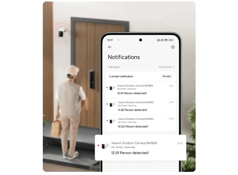 ვიდეო სათვალთვალო კამერა Xiaomi Outdoor Camera BW500 არის მაღალი ხარისხის გარე უსაფრთხოების სისტემა, რომელიც უზრუნველყოფს მკვეთრ და დეტალურ გამოსახულებას ნებისმიერ ამინდში. 2.5K მაღალი გარჩევადობის სენსორი უზრუნველყოფს სუფთა სურათს დღის და ღამის განმავლობაში, ხოლო ინტეგრირებული ინფრაწითელი და ფერადი ღამის ხედვა იძლევა სრულ კონტროლს დაბალი განათების პირობებშიც. კამერა აღჭურვილია ფართო ხედვის კუთხით, მოძრაობის სენსორით და ორმხრივი ხმოვანი კომუნიკაციით, რაც საშუალებას გაძლევთ დაუკავშირდეთ სტუმრებს დისტანციურად. წყალგამძლე (IP66) კონსტრუქცია უზრუნველყოფს გამძლეობას წვიმისა და მტვრის მიმართ. BW500 მუშაობს Mi Home აპლიკაციასთან და გთავაზობთ მარტივ მონიტორინგს რეალურ დროში.