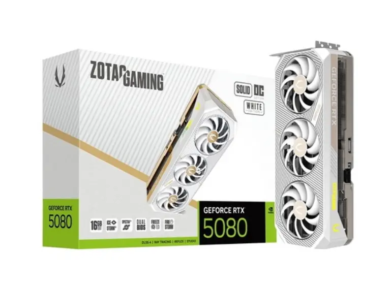 ZOTAC GAMING GeForce RTX 5080 SOLID OC White Edition (ZT-B50800Q-10P) წარმოადგენს უახლესი თაობის გრაფიკულ დაფას, რომელიც დაფუძნებულია NVIDIA-ს Blackwell არქიტექტურაზე. ის აღჭურვილია 10752 CUDA ბირთვით, 16GB GDDR7 მეხსიერებით და 256-ბიტიანი მეხსიერების ინტერფეისით, რაც უზრუნველყოფს უმაღლეს გრაფიკულ წარმადობას. ბუსტ რეჟიმში ბირთვის სიხშირე აღწევს 2640 MHz-ს, ხოლო მეხსიერების სიჩქარე 30 Gbps-ს. კარტა მხარს უჭერს PCIe 5.0 ინტერფეისს და აღჭურვილია 1x HDMI 2.1b და 3x DisplayPort 2.1b პორტებით. მისი თეთრი დიზაინი და RGB განათება იდეალურად ერგება თანამედროვე კომპიუტერულ სისტემებს. რეკომენდებულია 850W კვების ბლოკი.